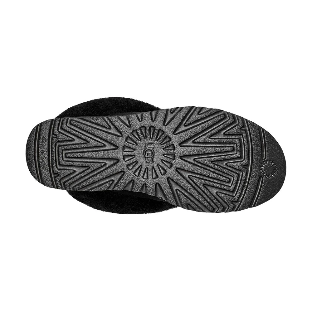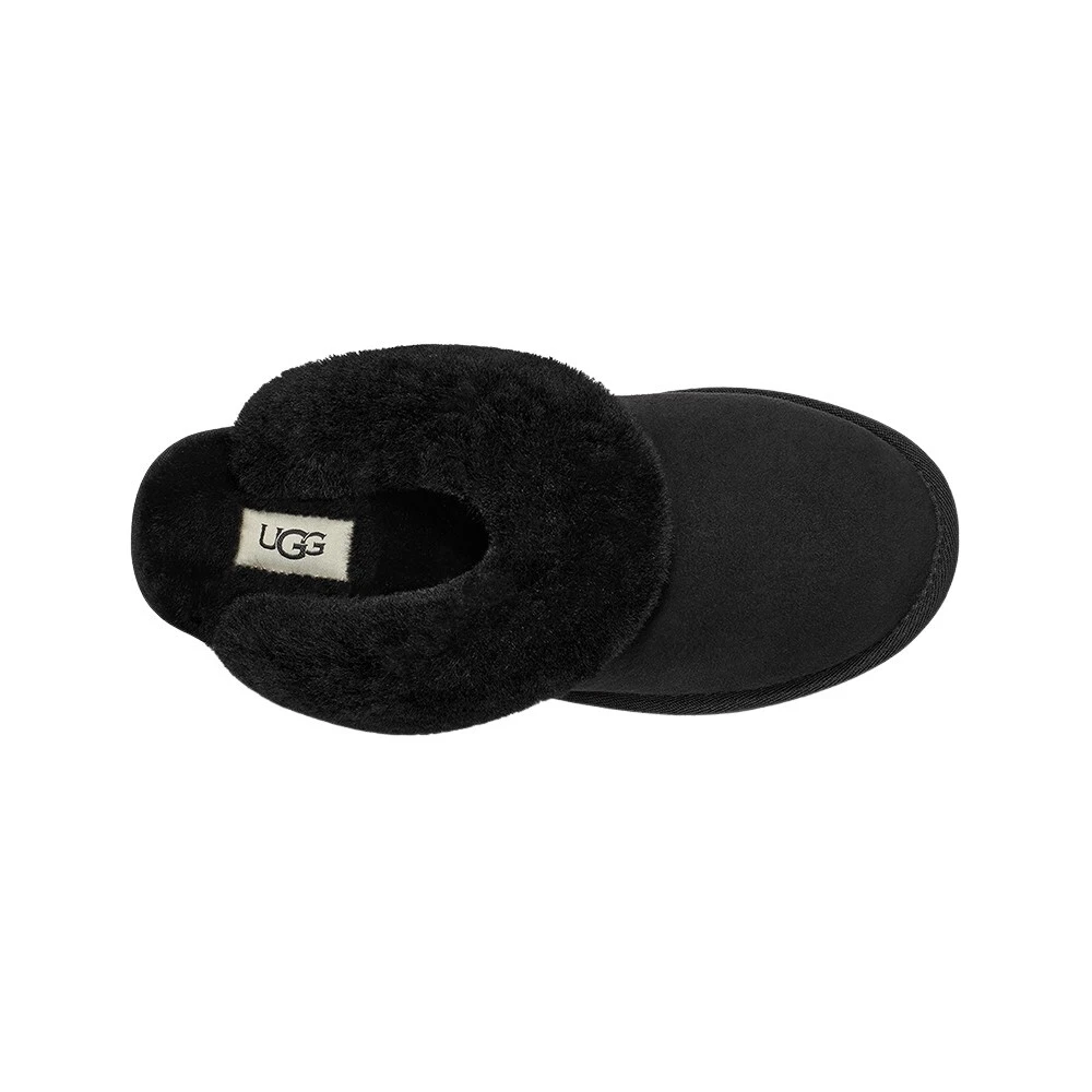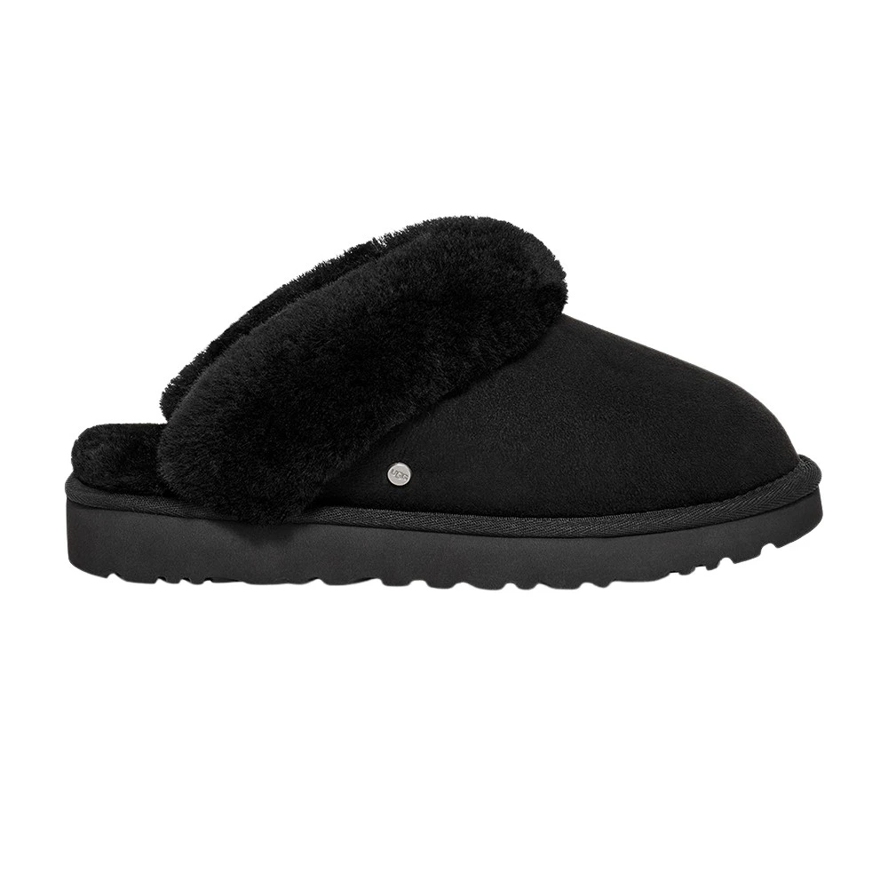 Oppgrader hjemmeskoene dine med UGG Clic Slipper II i svart. En nydesignet versjon av den ikoniske Scuffette med en plattform såle for et moderne utseende. Den myke svarte shearling-fôret og mansjetten gir luksuriøs komfort. Normal i størrelsen.