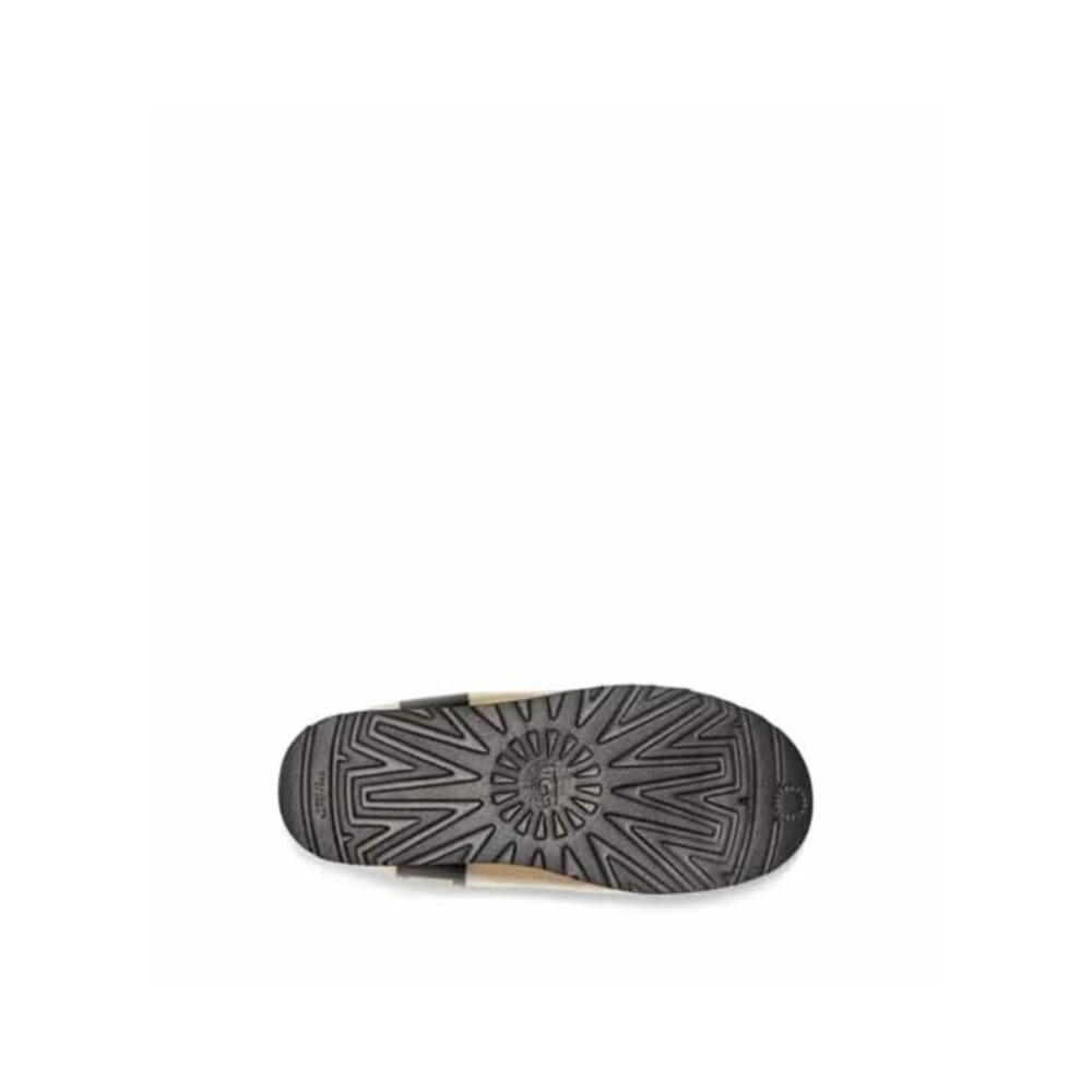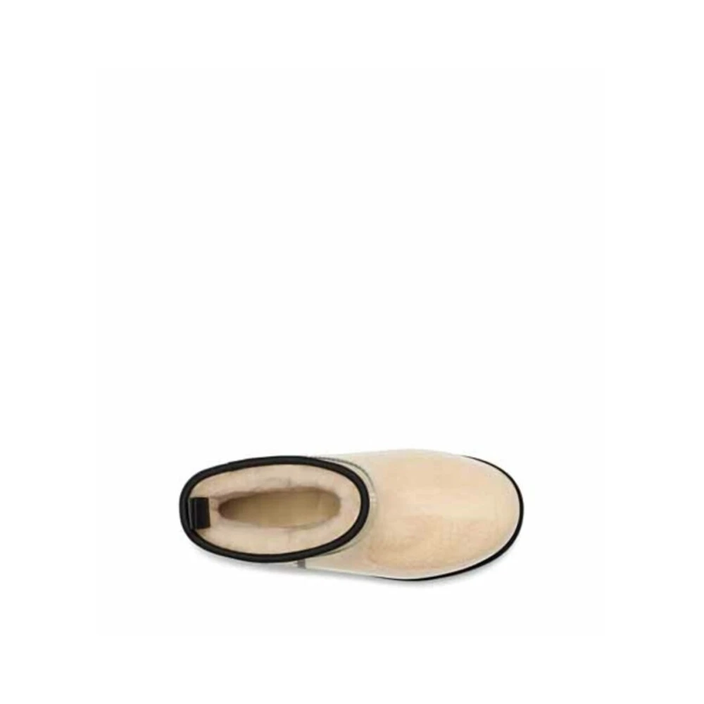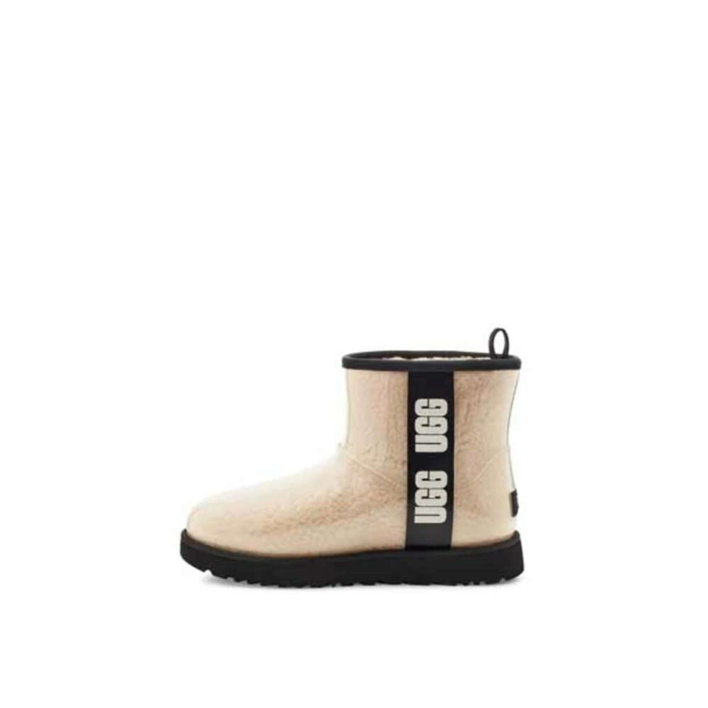 Beige og Black ‘Classic Clear Mini’ støvler fra Ugg. Med fleksibel, lett, kontrasterende såle og vannmotstand. Anriket av svarte striper med hvit UGG-logo på sidene, logo-lappen og pull-up-sløyfen bak.