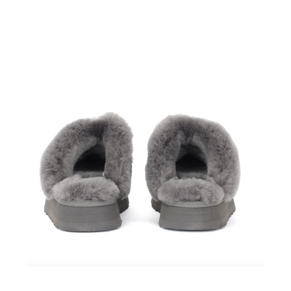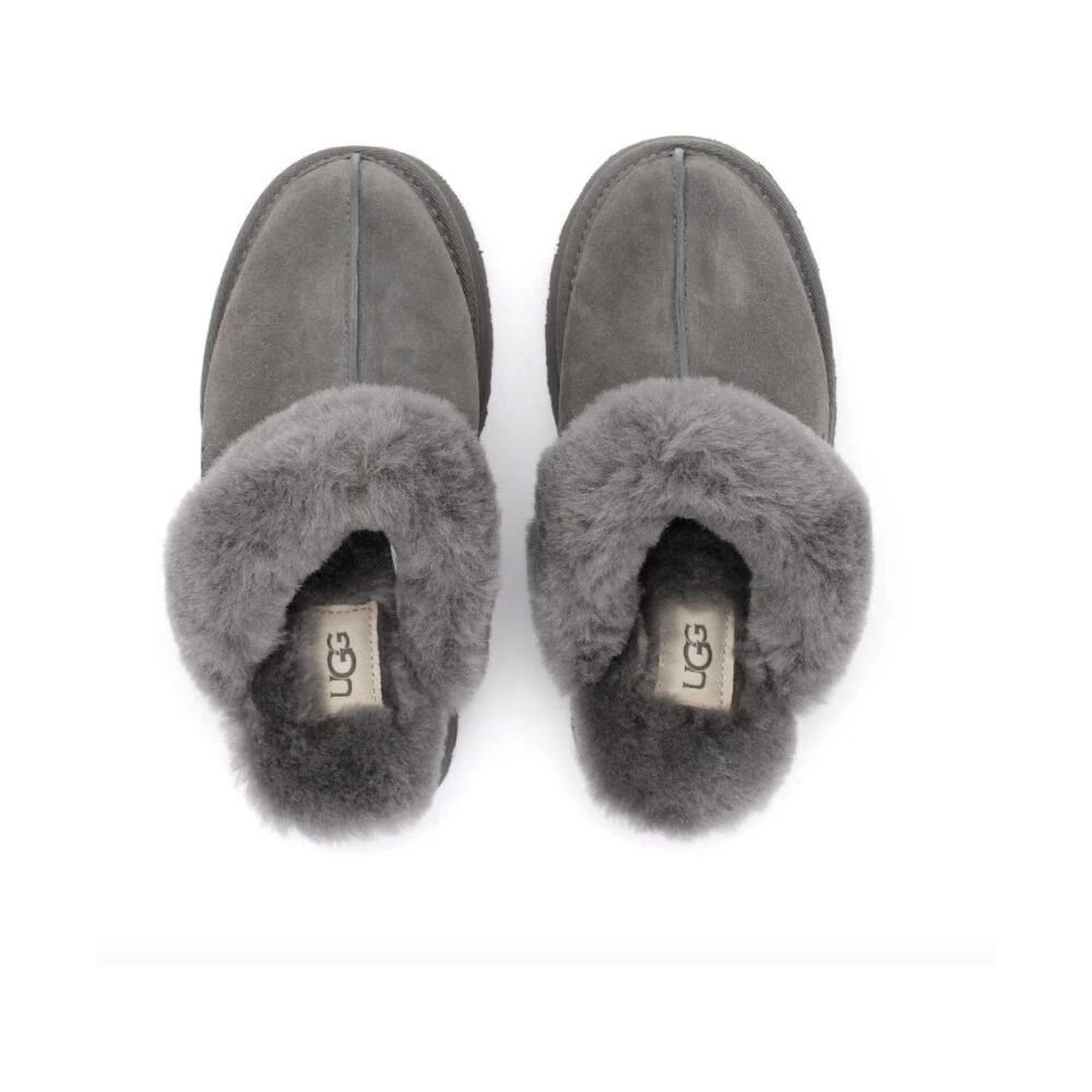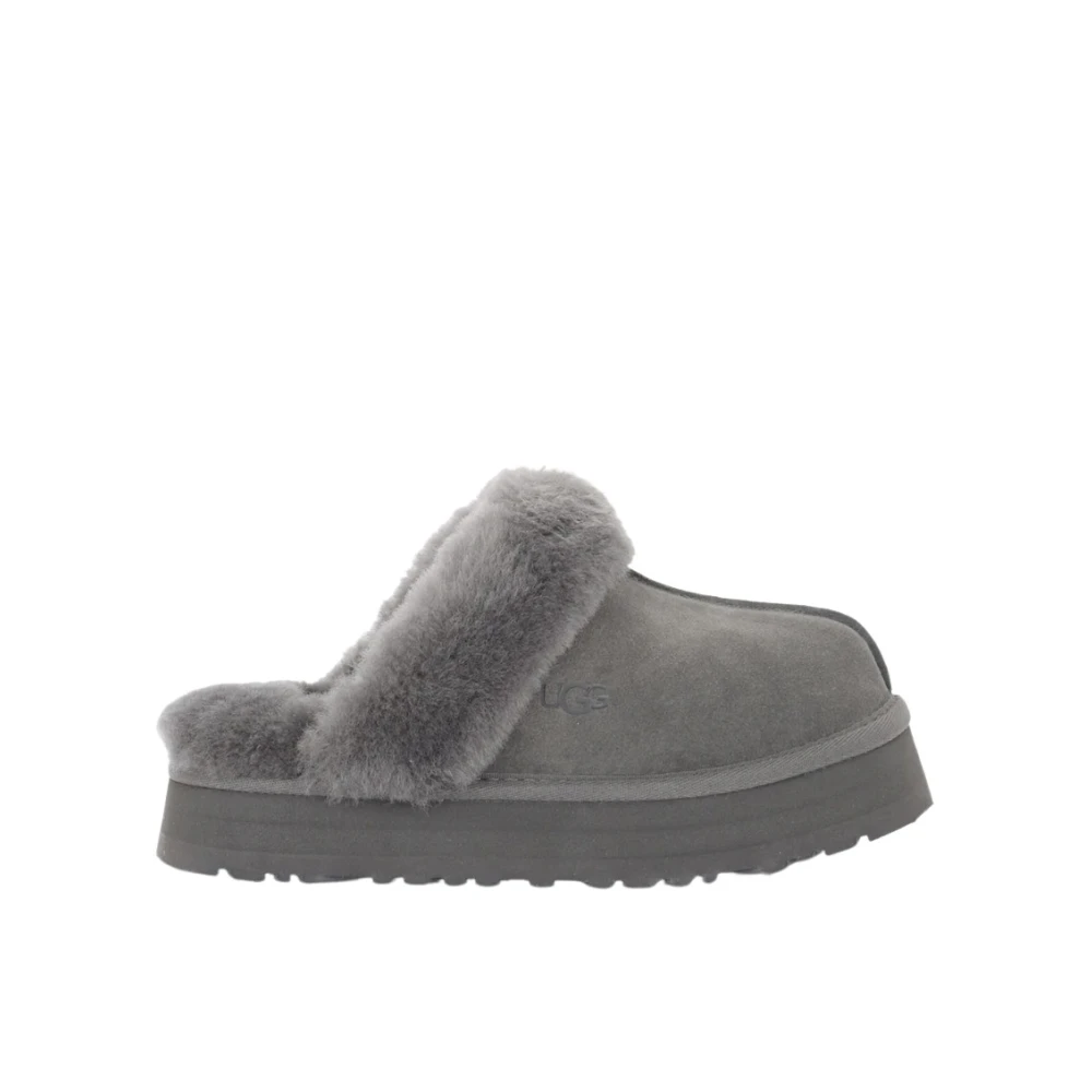 Hold deg koselig og stilig med UGG`s Disquette Slippers. Disse tøflene har en overdel av semsket skinn og saueskinn, med en saueskinn interiør og innersåle for ultimate komfort. Den høykvalitets plastikksålen gir holdbarhet, mens den 2,5 cm høye plattformhøyden legger til litt høyde. Produktstil-ID: 1122550-CHRC.