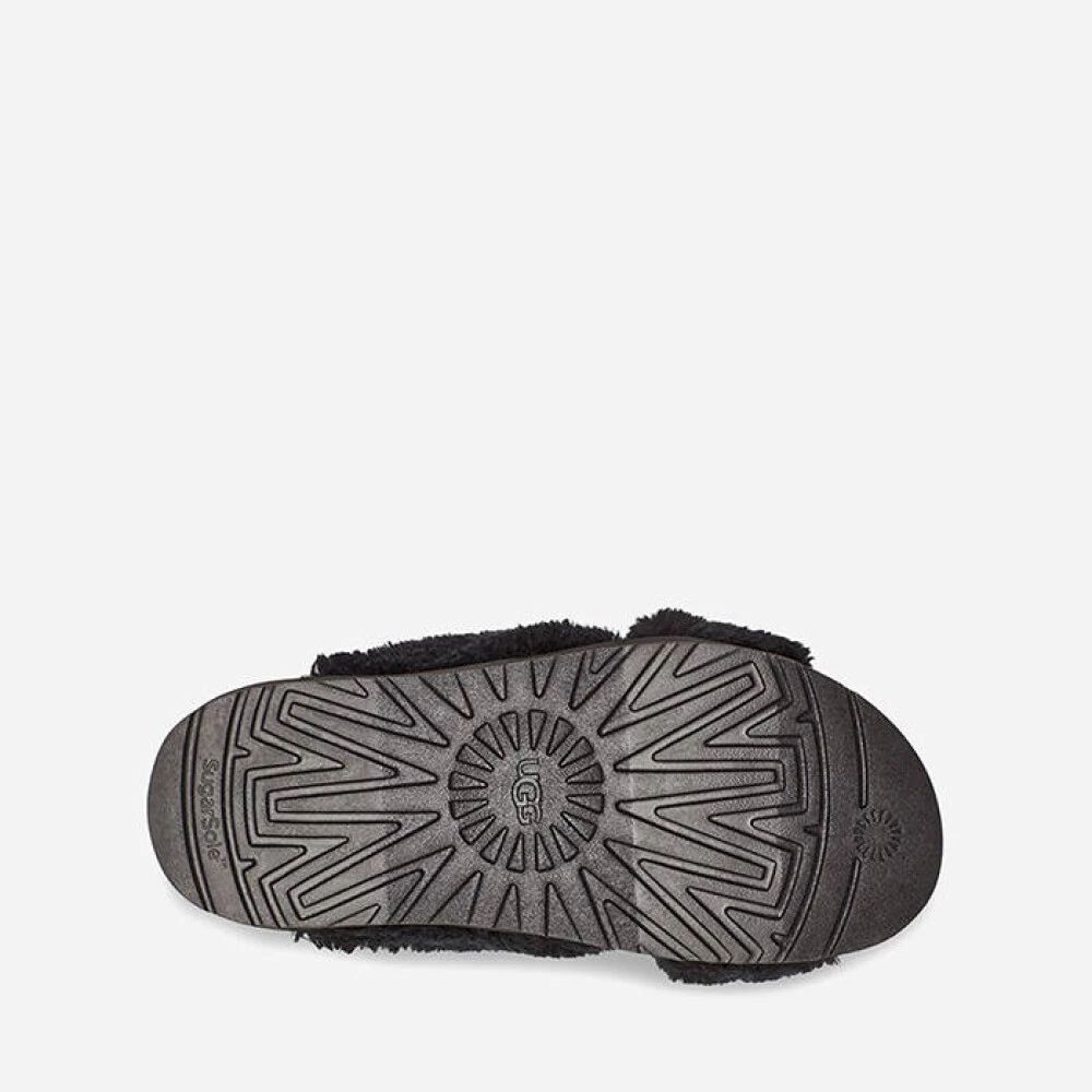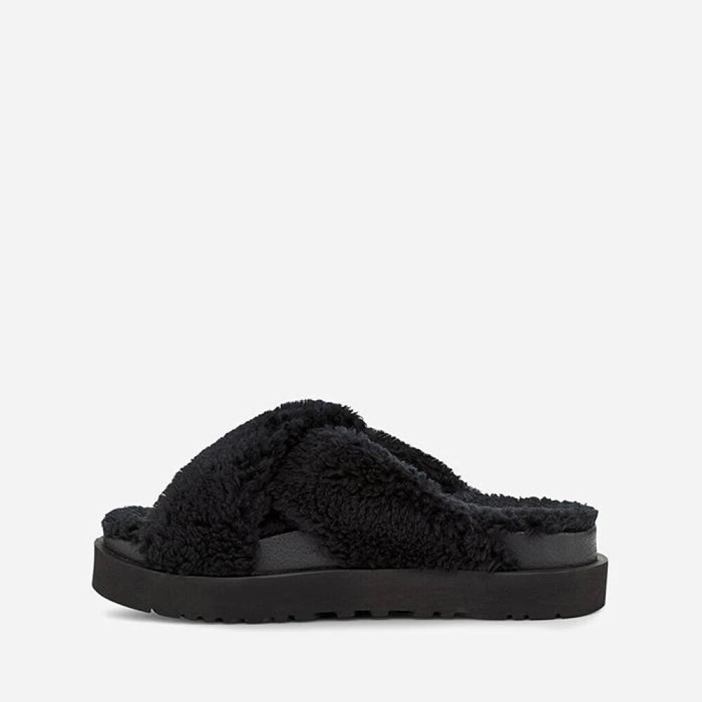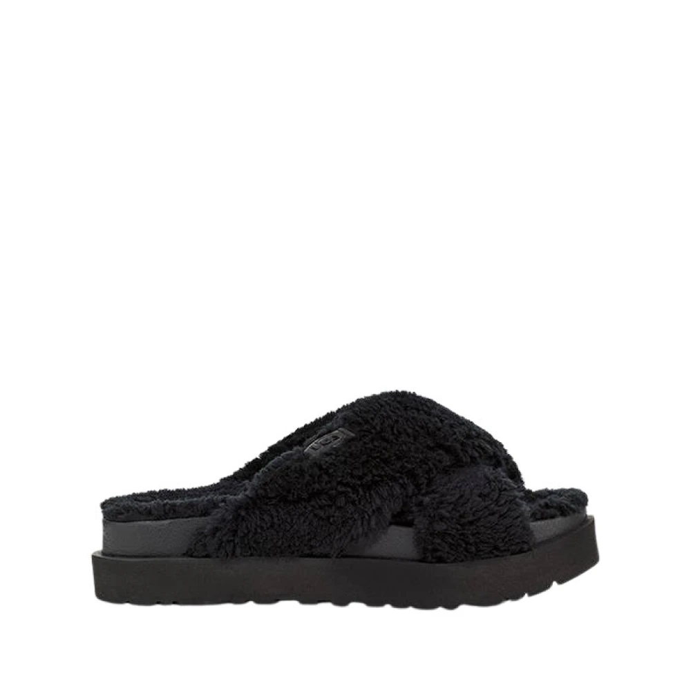 Introduserer UGG Fuzz Sugar Cross Slides, perfekt for den motebevisste kvinnen som elsker komfort og stil. Disse flate skoene er laget med en 10mm krøllete plysj tekstil øvre og fôr, bestående av 50% resirkulert ull og 50% TCEL™ Lyocell. Innersålen er også laget med samme materiale for ultimate komfort. Produktstil ID er 1120860.